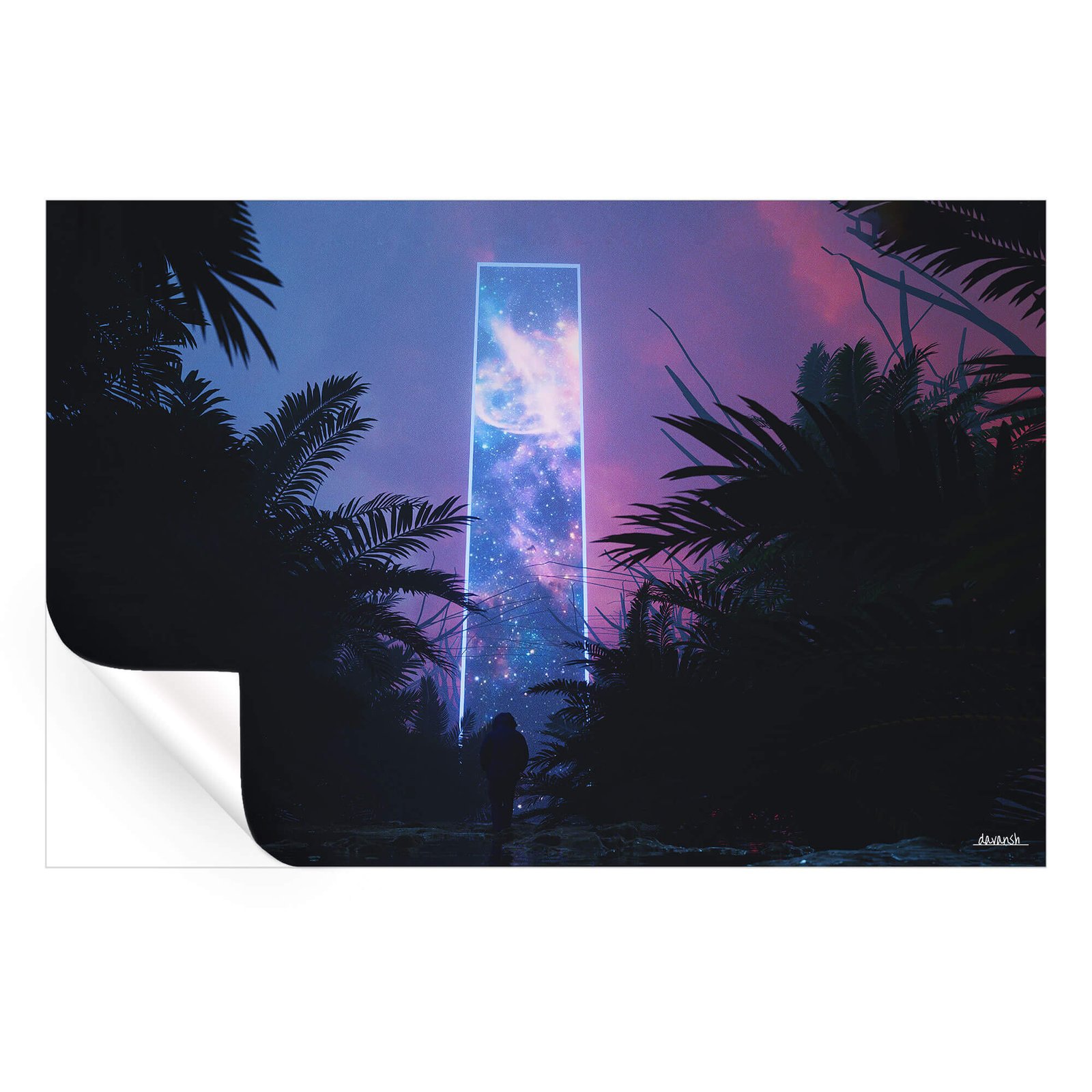 This image shows a person standing in front of a tall, door-shaped portal that looks out into a starry night sky with a bright moon and nebulae. The portal is glowing and seems magical. Around the person are dark silhouettes of palm trees, and it looks like they are in a tropical forest. The sky behind the portal has pink and blue colors, like a sunset or sunrise.