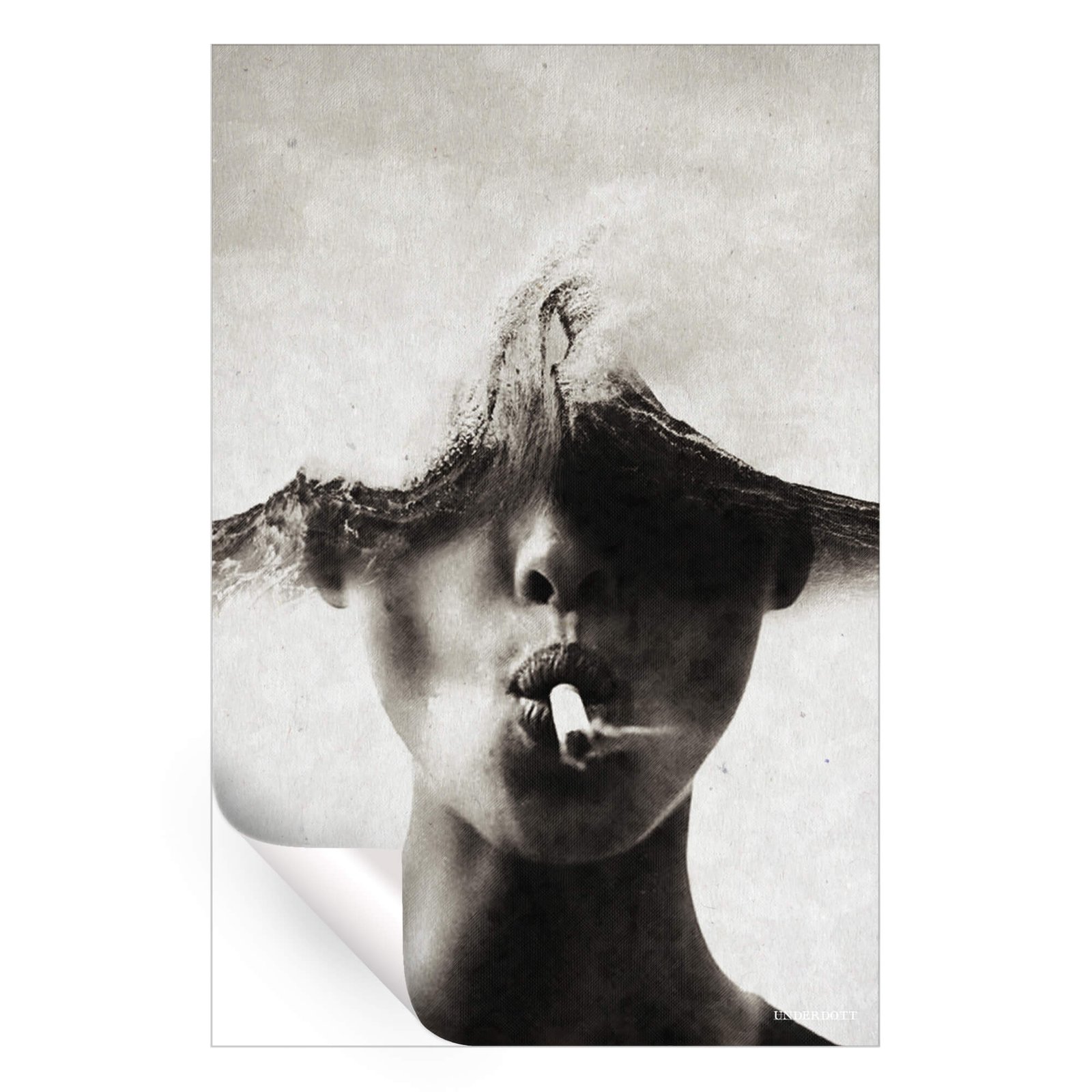 Lips parted, a dangling cigarette gently burns, leaving a trail of smoke. The texture of the image is grainy, giving it a vintage or aged appearance.