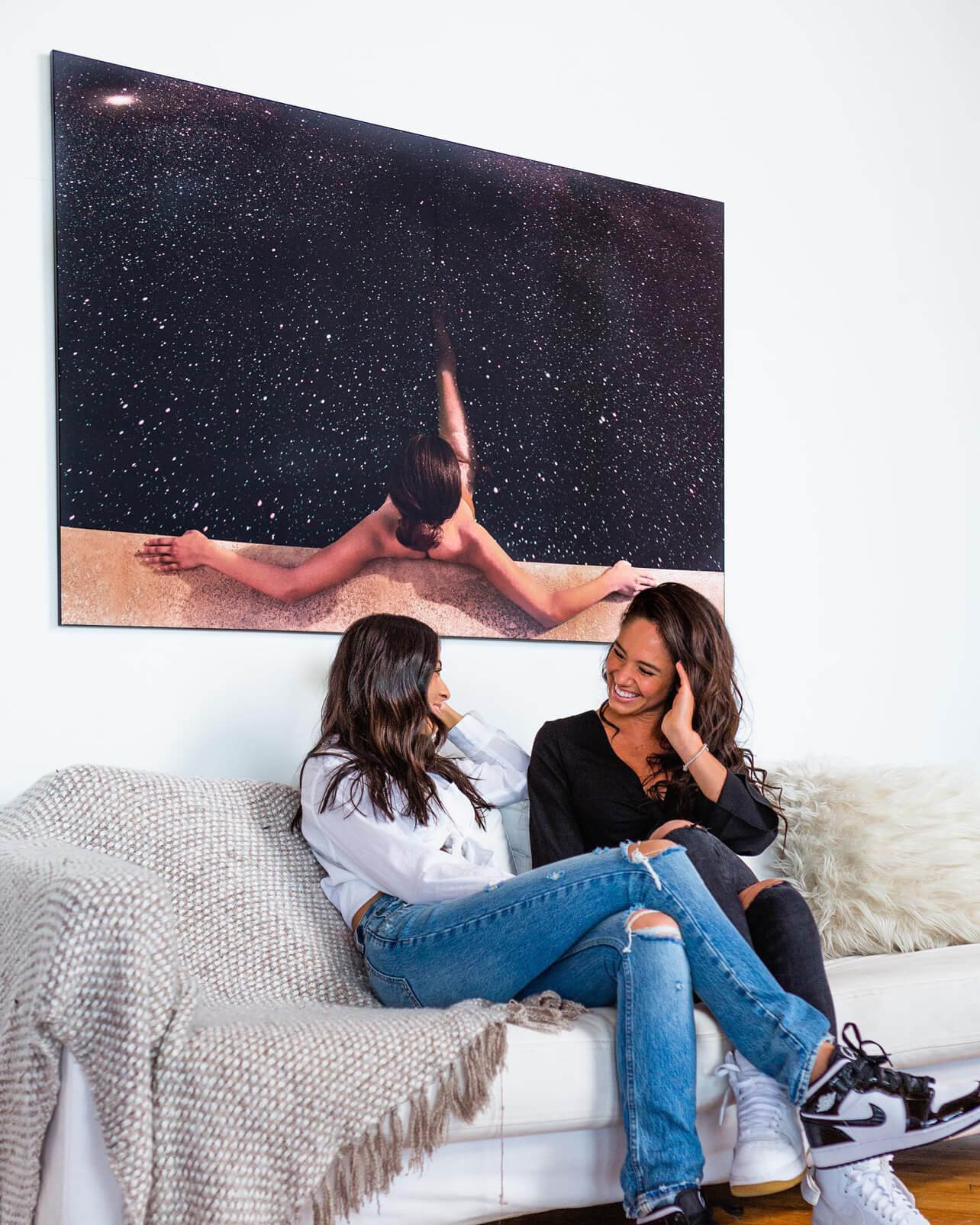 A muted palette of peach, tan, and charcoal keeps the composition soothing, yet the bright pinpoints of light add sparks of jubilation. Viewed from above, the body forms a subtle cross shape, hinting at holy symbolism while remaining firmly indie and modern. Rodríguez’s gentle grain and cinematic shadows make the scene feel both photographic and dreamlike. The artwork’s horizontal layout expands a wall like a doorway to outer space, ideal for extended stretches above a sofa or bed.