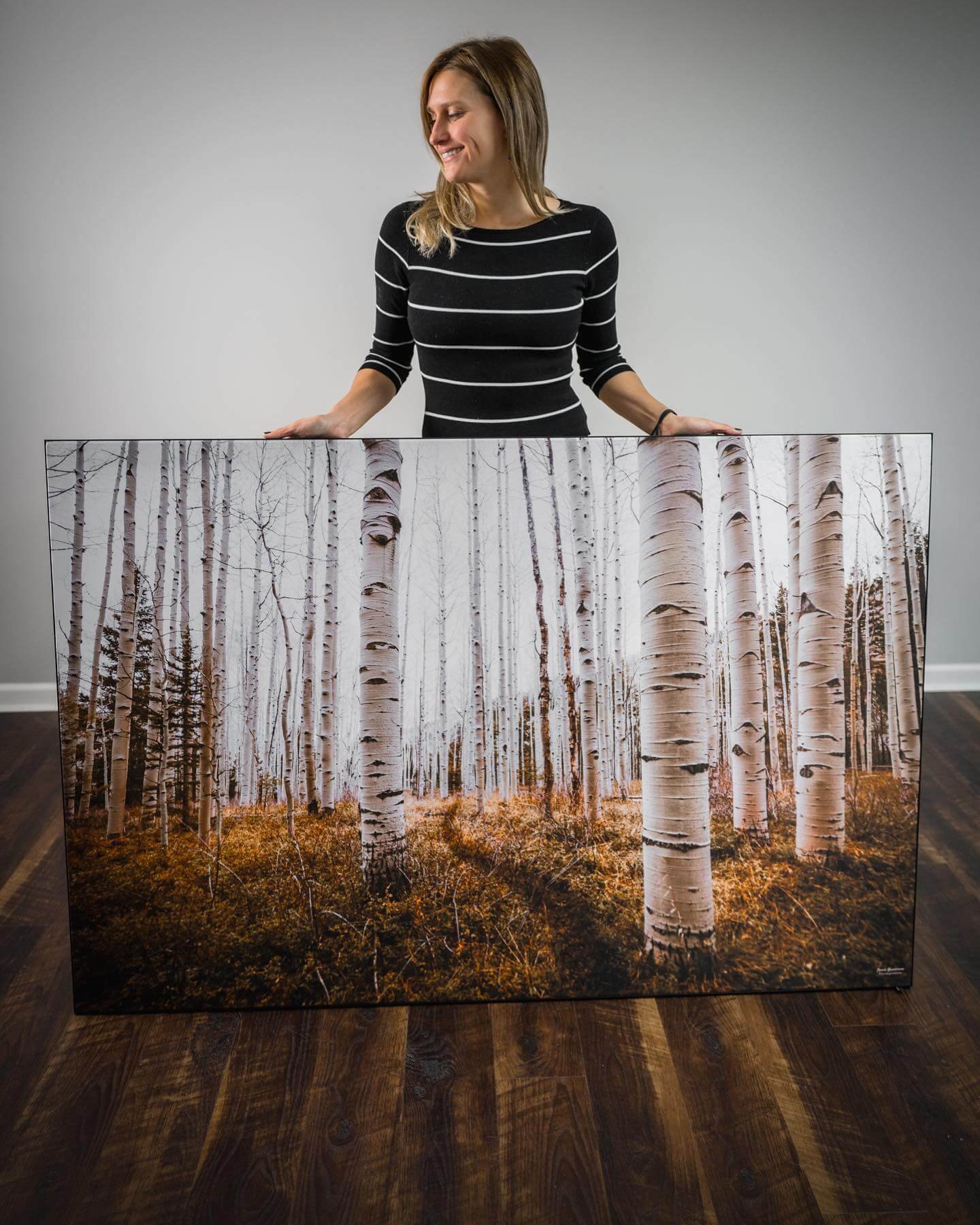 In the distance, hints of evergreen break the monochrome rhythm and add depth to the scene. Overcast skies diffuse the light so every detail looks evenly lit on the large photography wall art print. The absence of foliage heightens the elegant geometry of trunks against sky, a perfect fit for forestcore décor wall art. Gentle contrast and balanced tones create a calming yet slightly euphoric mood that lingers long after you step away.