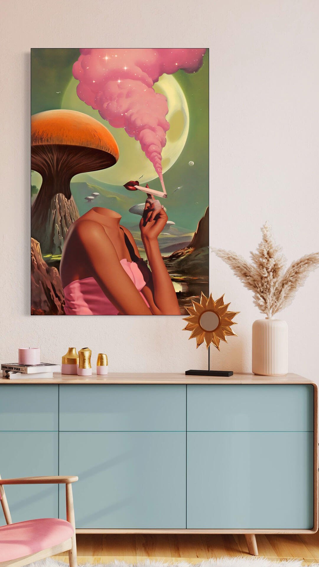 Featuring a woman from behind holding a smoking airplane. The background is a fantastical scene with oversized mushrooms, a pink smoke trail leading to a pastel sky, and a large celestial body. The composition has a dreamlike quality, merging elements of nature with whimsical human intervention, likely created through digital collage techniques.