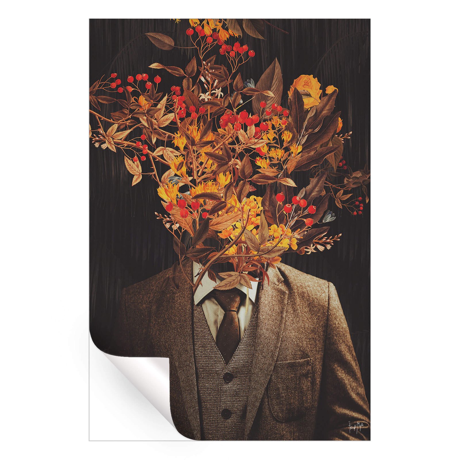 A lone wanderer stands on a quiet road lit by low afternoon sun. His torso dissolves into sepia sky, and where a face should be blooms a lush orange flower, its petals echoing the foliage that carpets the hills behind him. Deep browns melt into warm ochres, forming a surreal valley that feels at once nostalgic and futuristic. Thin power lines climb the slope, guiding the eye upward to a cloudless horizon. Each element is crisply layered, yet the edges are softened by Frank Moth’s retro collage style. The vertical layout pulls you forward as if stepping into an endless fall afternoon. Light, texture and color converge in a euphoric hush, perfect for calm reflection.