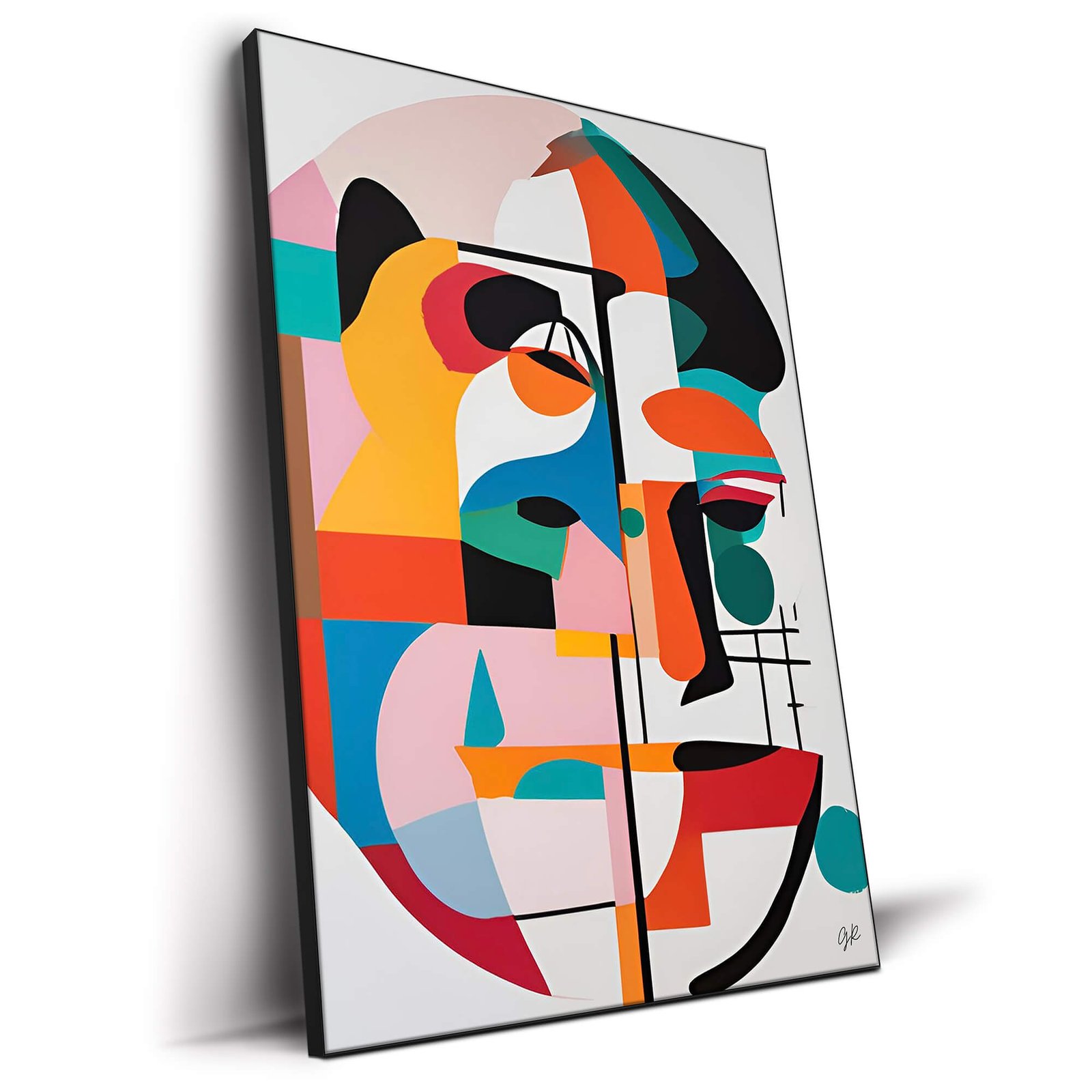 The image shows an abstract face split into interlocking planes of turquoise, tangerine, blush, and teal. Jagged black lines anchor the composition while soft arcs lighten the mood. Blocks of saturated red and deep green meet airy pastel sections, keeping the eye moving across every inch of the vertical format. Negative space outlines cheeks and brows, turning absence into line. Subtle grid marks in the lower right hint at urban architecture. A sweeping half-circle in the lower left balances a dark swoop on top, giving the silhouette a playful symmetry. Close up, brushy textures are replaced by ultra-sharp edges, a testament to high definition printing.