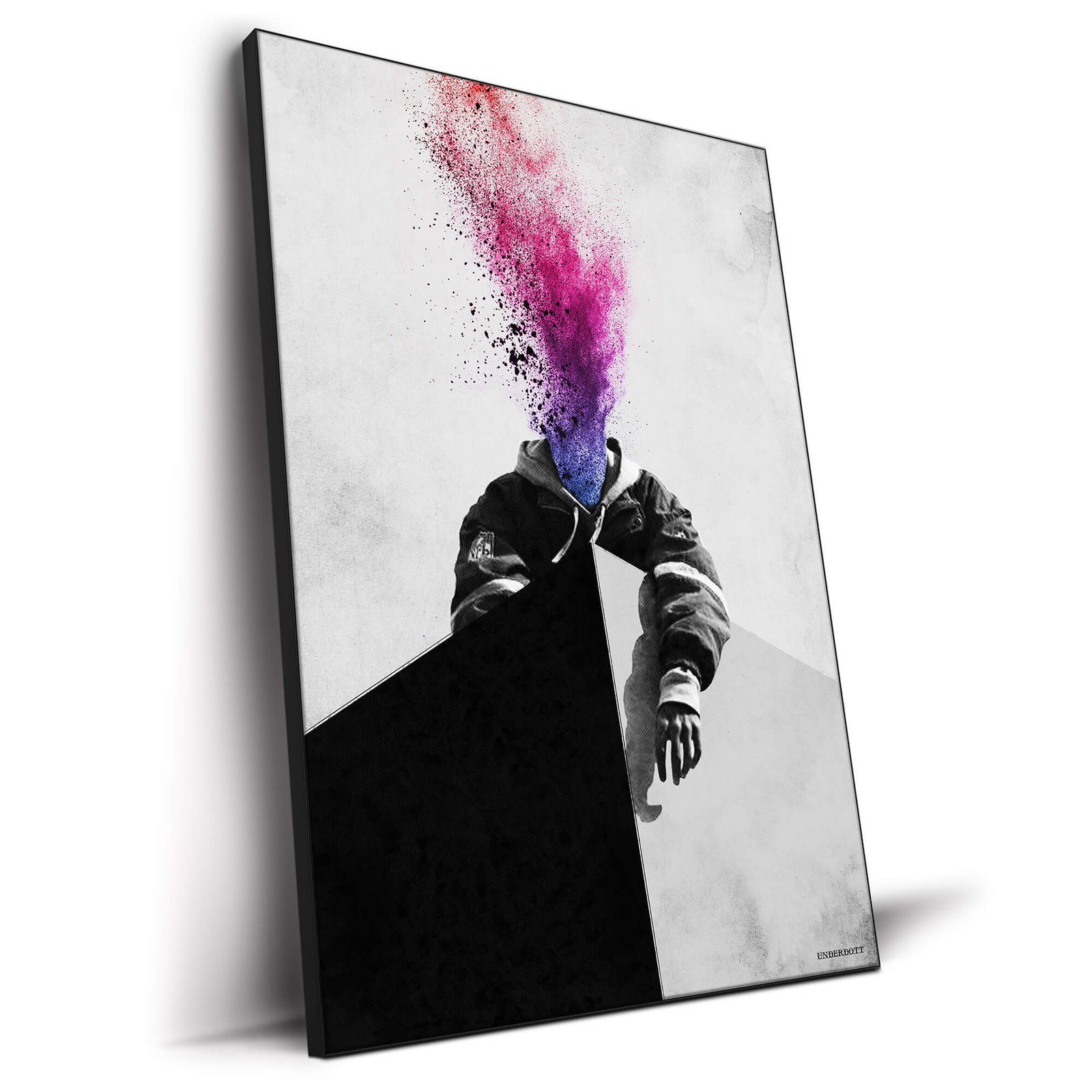 Known for merging digital collage with spray-painted textures, creating hybrid visuals that question identity and conformity. Burnout echoes the artist’s fascination with fragmented faces and explosive color trails that symbolize thought overload. Explore more in the Underdott art collection to see how monochrome bodies and vibrant particle clouds recur throughout his punk-inspired portfolio.