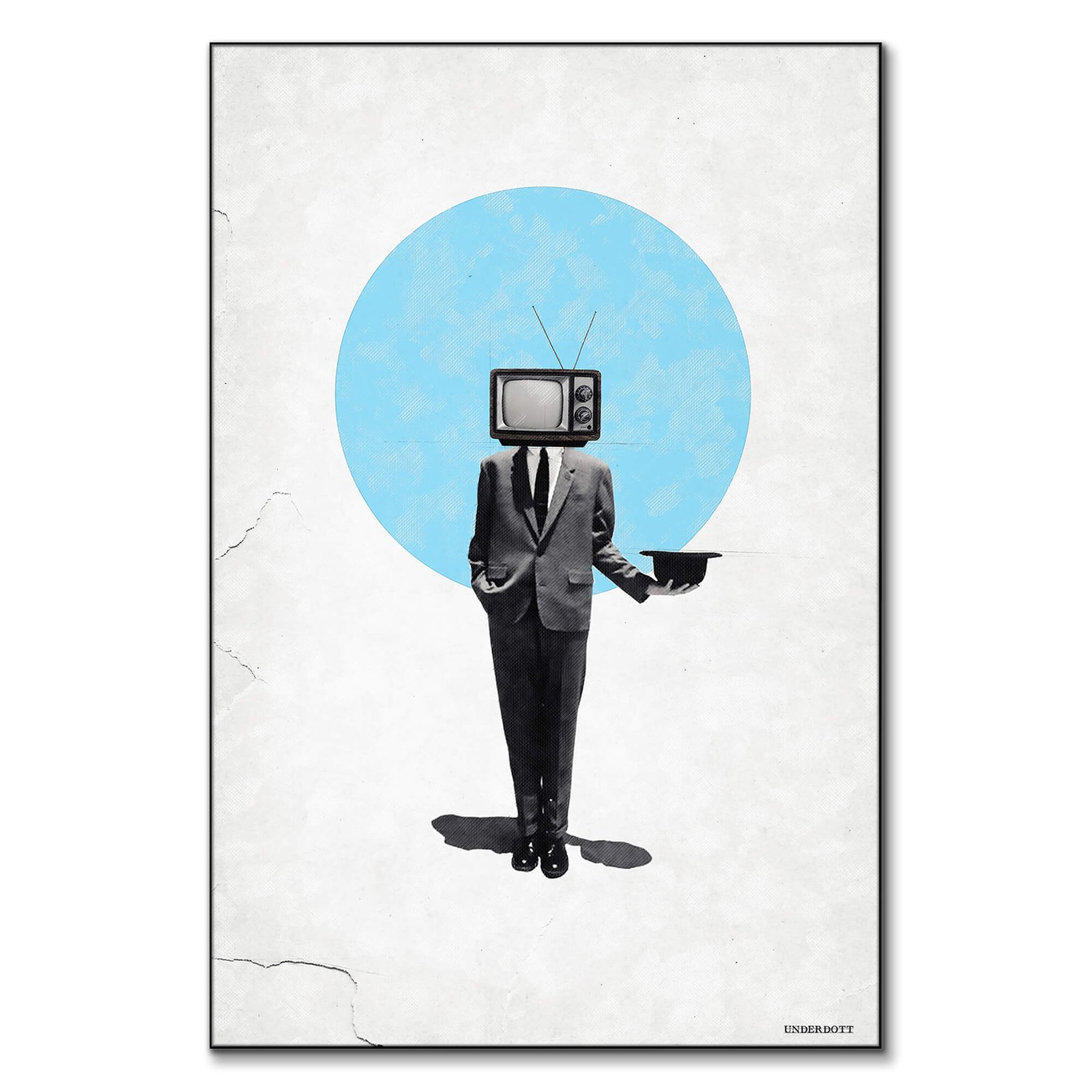 A soft cyan disc glows behind the figure, framing the TV head like a halo and adding a single note of color to the grayscale suit. Clean negative space surrounds the forms, emphasizing the vertical posture and heightening the dreamlike calm. The contrast of the black shoes, tie, and shadow against the white field keeps the eye grounded while the blue circle invites quiet reflection. This offbeat blend of nostalgia and whimsy slides naturally into the surreal large wall art collection and flirts with eclectic vintage wall décor tropes.