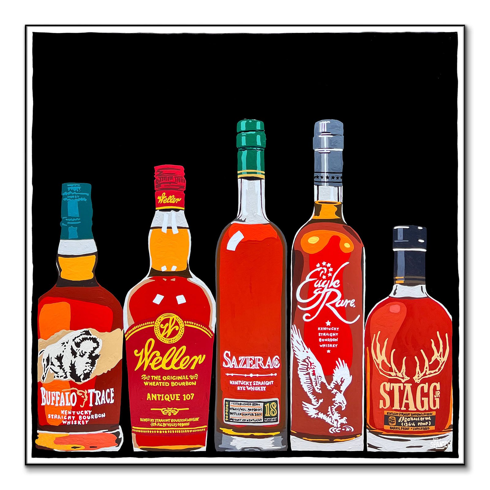 Elevate your space with this stunning artwork showcasing a collection of premium bourbon bottles. Featuring renowned labels like Buffalo Trace, Stagg, and Sazerac, this piece brings a touch of sophistication and warmth to any bar or living area. Ideal for bourbon enthusiasts, this artwork is a celebration of craftsmanship and quality.