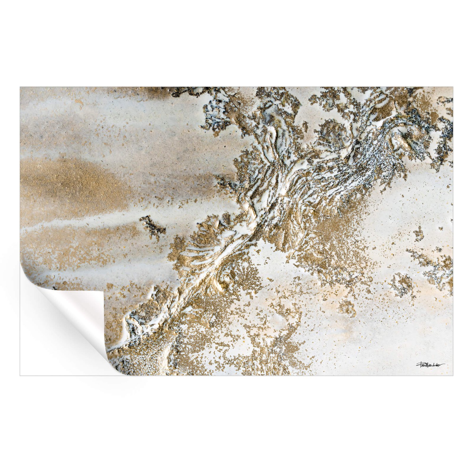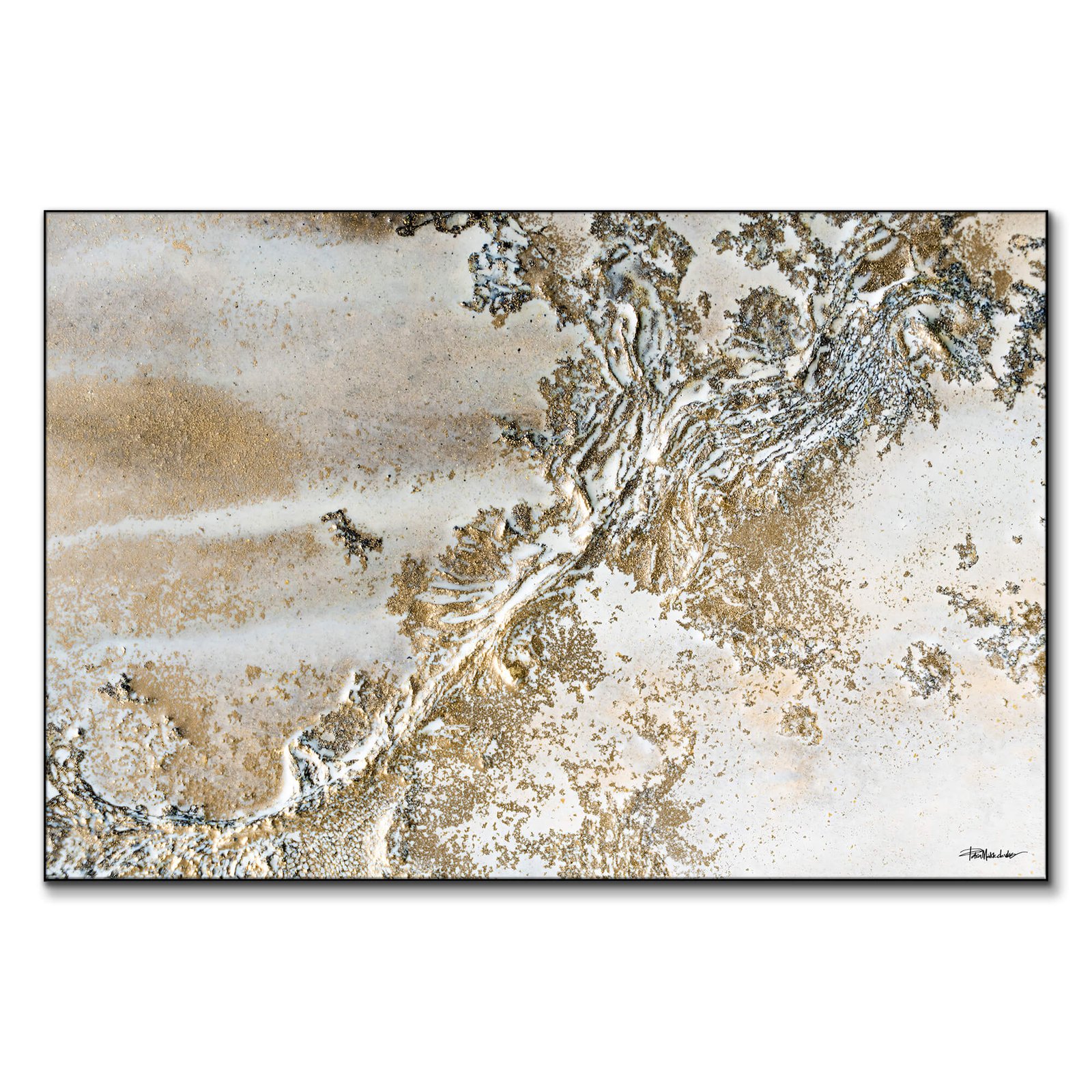 The intricate topographic design of this artwork is brought to life with a rich gold outline against the clean backdrop of soft whites and grays. The subtle textures create an almost geological feeling, as though exploring hidden landscapes or layers beneath the surface. The delicate use of gold highlights adds a sense of sophistication and depth, transforming the piece into a work of art that’s both contemporary and timeless.