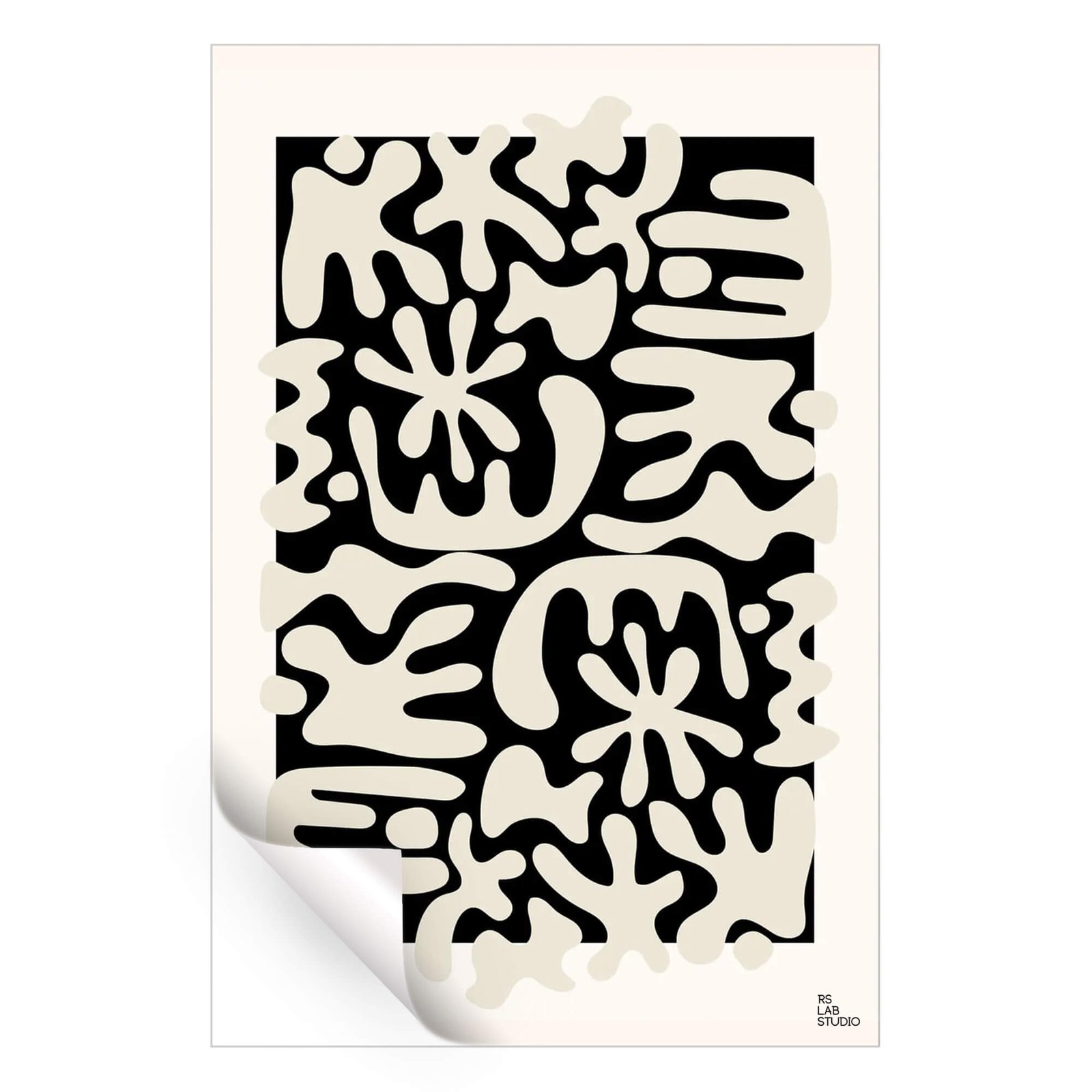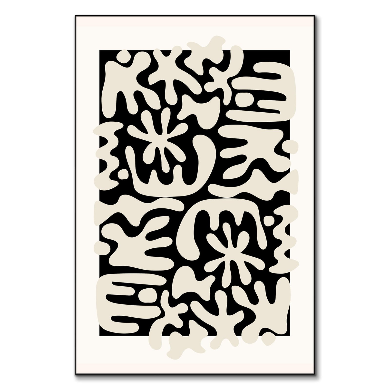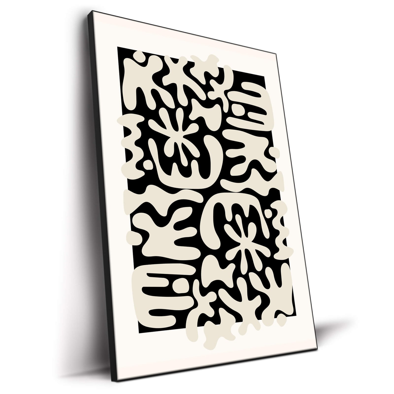 Discover a fusion of abstract forms with this striking wall art, which presents a mesmerizing array of tan shapes on a deep black backdrop. Each form interlocks with the next in a dance of curves and lines, reminiscent of ancient hieroglyphs or modernist glyphs. This piece invites interpretation and wonder, a bold statement that captivates and sparks the imagination.