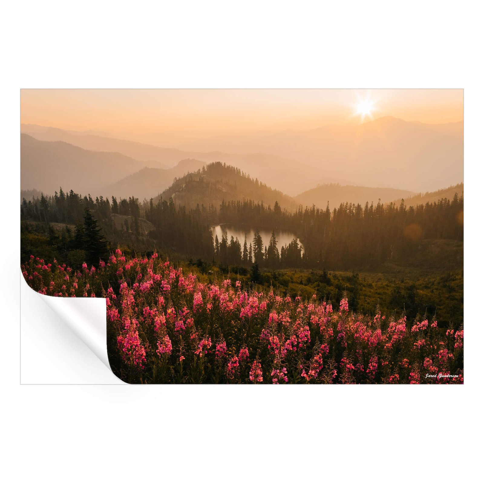 Catch the early morning sunrise with Jared Gunderson on Wildflower Island. Covered in Pink Flowers with the sun is peeking out over the hills, making everything glow with a soft, golden light