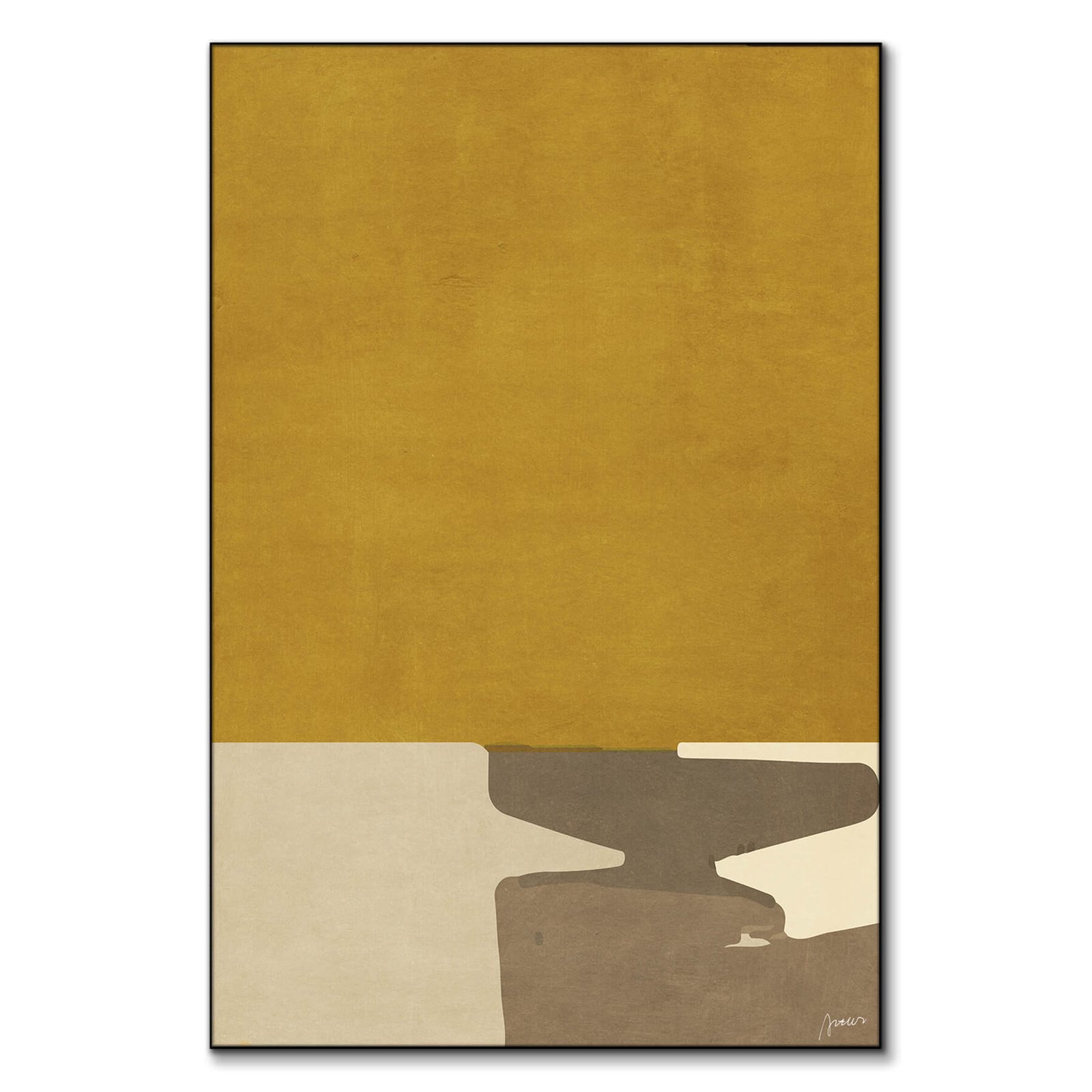 Warm ochre dominates the upper two thirds of the composition, softly textured like sunlit stucco. A crisp horizontal divide suggests a distant horizon. Below, interlocking beige and taupe forms resemble land, water, and their mirrored reflections. Gentle tonal shifts add depth without breaking the piece’s calm. Negative space invites the viewer’s imagination to drift between shapes. Minimal marks and subdued hues keep the focus on balance and quiet energy. The vertical orientation heightens the sense of still water reaching toward open sky. Hints of stone grey anchor the scene while a sliver of cream provides subtle contrast.